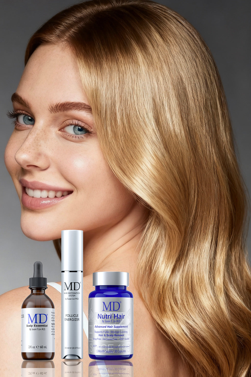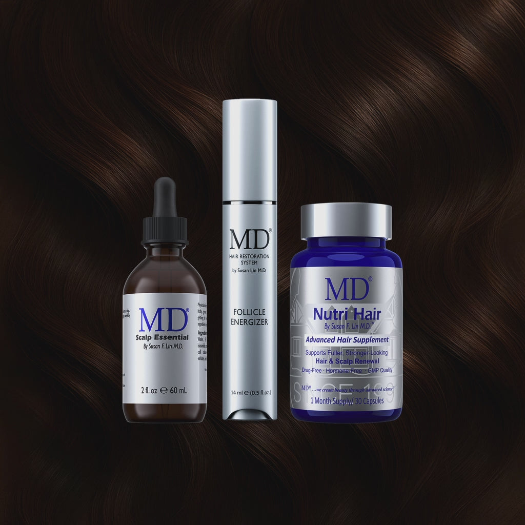 The set includes three simple steps: • Step 1: MD Scalp Essential — Apply once daily to a clean, dry scalp to exfoliate, balance oil, and energize follicles. • Step 2: MD Follicle Energizer — Apply once daily to thinning or shedding areas using the precision applicator. This serum helps activate follicles and stimulate new hair growth. • Step 3: MD Nutri Hair — Take one capsule daily to nourish your hair from within, promoting thicker, shinier hair and restoring fullness.
